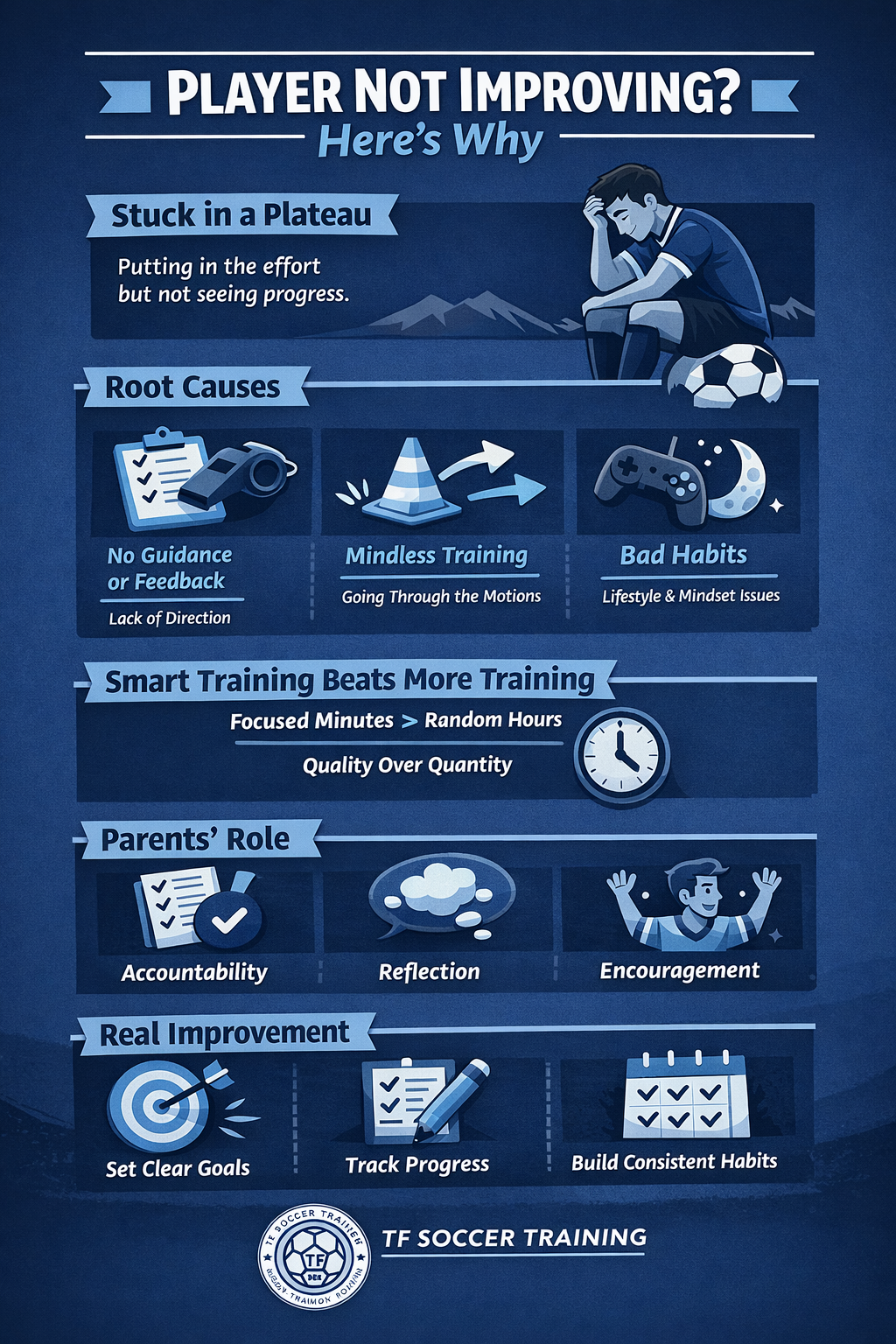 If your soccer player is putting in effort but not improving, the issue usually isn’t talent or time—it’s how they’re training. Random reps, lack of feedback, and poor habits stall development. Real improvement comes from focused training, clear goals, accountability, and consistent habits—not just doing more.